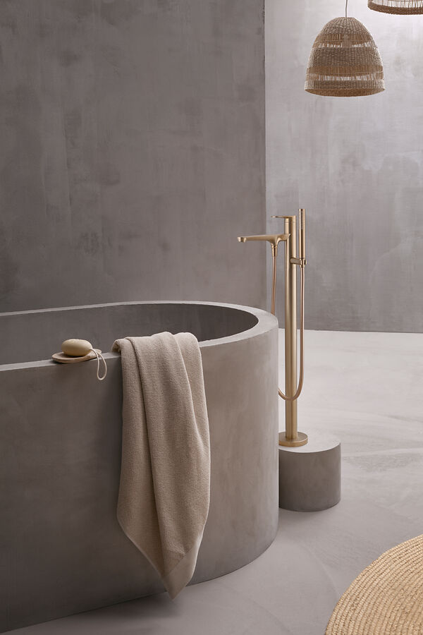 Die freistehende Badewannenarmatur hat eine starke und skulpturale Präsenz, die durch einen Sockel erhöht wird, der die klaren, vertikalen Linien verstärkt.